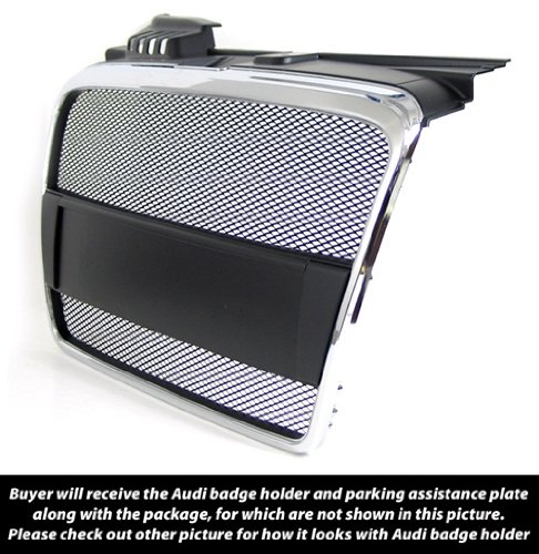 05-08 Audi A4 (B7) Front Mesh Sport Grille Grill Kit Chrome 06 07 . Remark:1. It is necessary to remove front bumper in order to complete the front grille installation 2. This grille is lighter than the stock grille 3. Buyer will receive the Audi badge holder and parking assistance cover plates along withs the package. Please check out the installed pictures to compare how it looks on the Audi A4 when it's installed with or without Audi badge holder. 4. This grille does NOT come with the Audi Emblem. Buyer has to reuse the stock Audi emblem. 5. In case if you want to paint this grille in other color, please be advised that it requires prep work and primer before painting. All aftermarket grilles (except chrome) require prep-work prior to painting, and this is considered completely normal.FAQ: Q. Does this grille fit on S-Line bumper? A. Since we have not tested it on the S-Line bumper yet, we are not sure if it fits on S-Line bumper or not.Q. Does this grille fit other Audi vehicle? A. No. It only fits on Audi A4. Q. What kind of material is this Audi Grille? A. This Audi grille is made of ABS plastic material, which is commonly used in the OEM grille. Q. Does this grille require any modification? A. No it does NOT require any modification to install this grille. Q. Does this grille require removal of the front bumper? A. Yes. It is necessary to remove the front bumper in order to install the grille. Q. Does this grille come with installation instruction? A. No it does NOT come with any installation instruction. The installation takes about one and half hours. Q. Does this front grille come with the Audi emblem? A. No. It does NOT come with the Audi emblem. Buyer need to reuse the stock Audi emblem.
